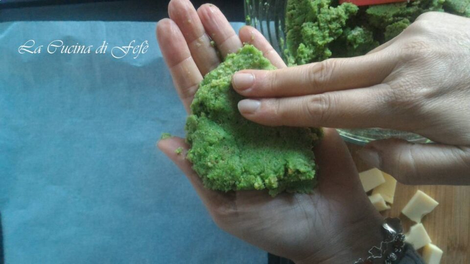 Con le mani preleva man mano delle quantità di impasto e schiaccia al centro leggermente per far posto al formaggio.