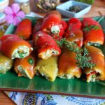 I fagottini di peperoni, sono un contorno vegetariano pieno di sapori e aromi, che potrà diventare facilmente anche uno sfizioso antipasto finger food. I peperoni, privati del peduncolo, cotti in forno e divisi in faldoni, vengono riempiti nei modi più svariati grazie alla loro versatilità. Il più diffuso è sicuramente a base di carne tritata o di salsiccia, ma non mancano versioni con le acciughe o con il pane raffermo. Insomma ce n’è per tutti i gusti! La mia personale versione prevede dei peperoni in stile vegetariano, molto colorati e succulenti, a base di pomodorini, noci, pan grattato, capperi, olive e tanti aromi, come rosmarino, menta e basilico. Profumatissimi! Quando li preparo, scopro sempre che non sono mai abbastanza! Provateli anche voi!