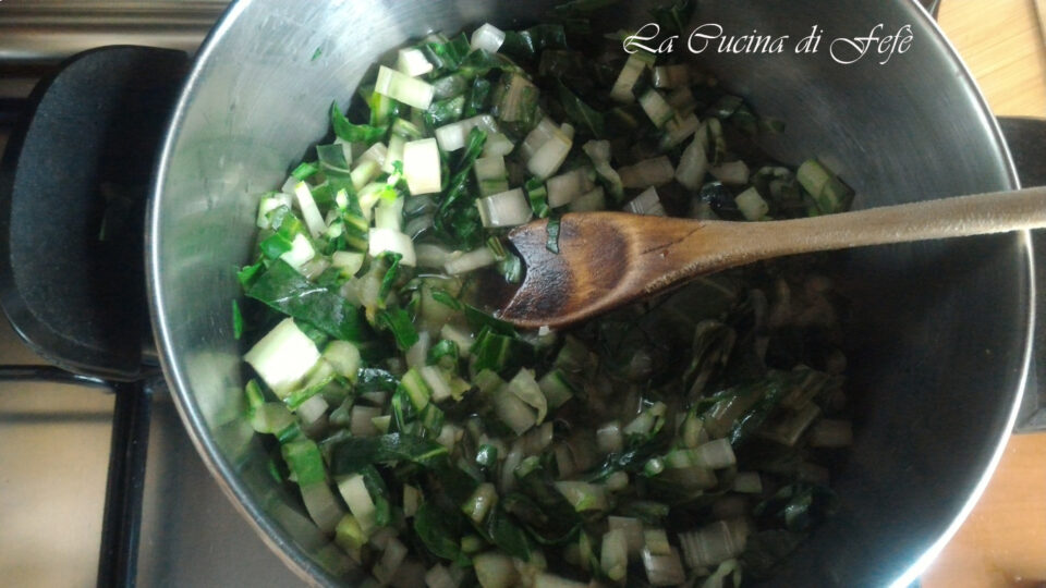 Aggiungete le bietole, fate insaporire un paio di minuti ancora, quindi coprite con 350 ml. di acqua calda e portate a bollore.