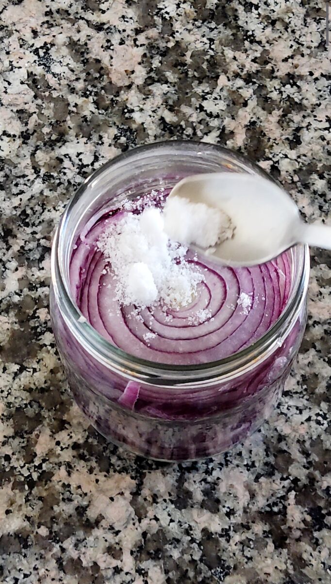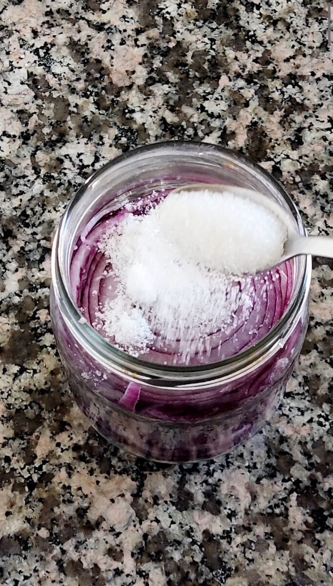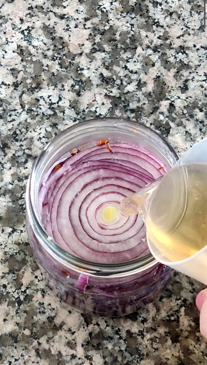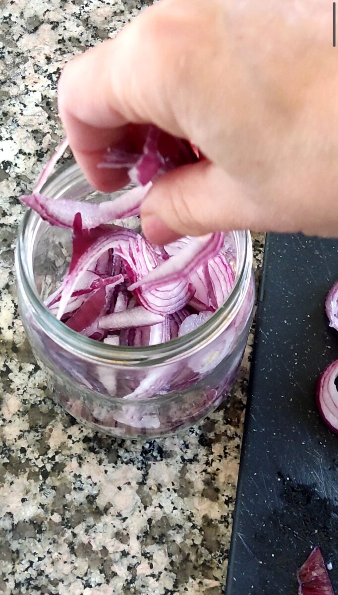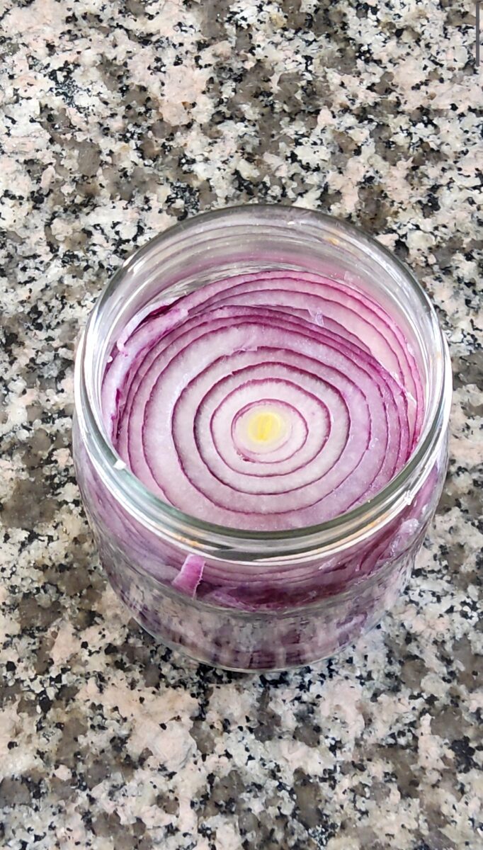 Trasferite le fettine di cipolle in un largo barattolo pulito e sterilizzato.