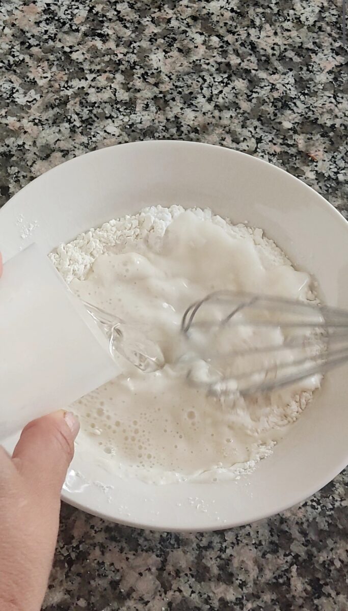 Preparate la pastella. Versate la farina in una ciotola. Aggiungete una presa di sale e mezzo cucchiaino di bicarbonato di sodio. Versate a filo l’acqua fredda gassata rigirando con una frusta per non far formare grumi. Dovete ottenere una pastella densa e liscia.