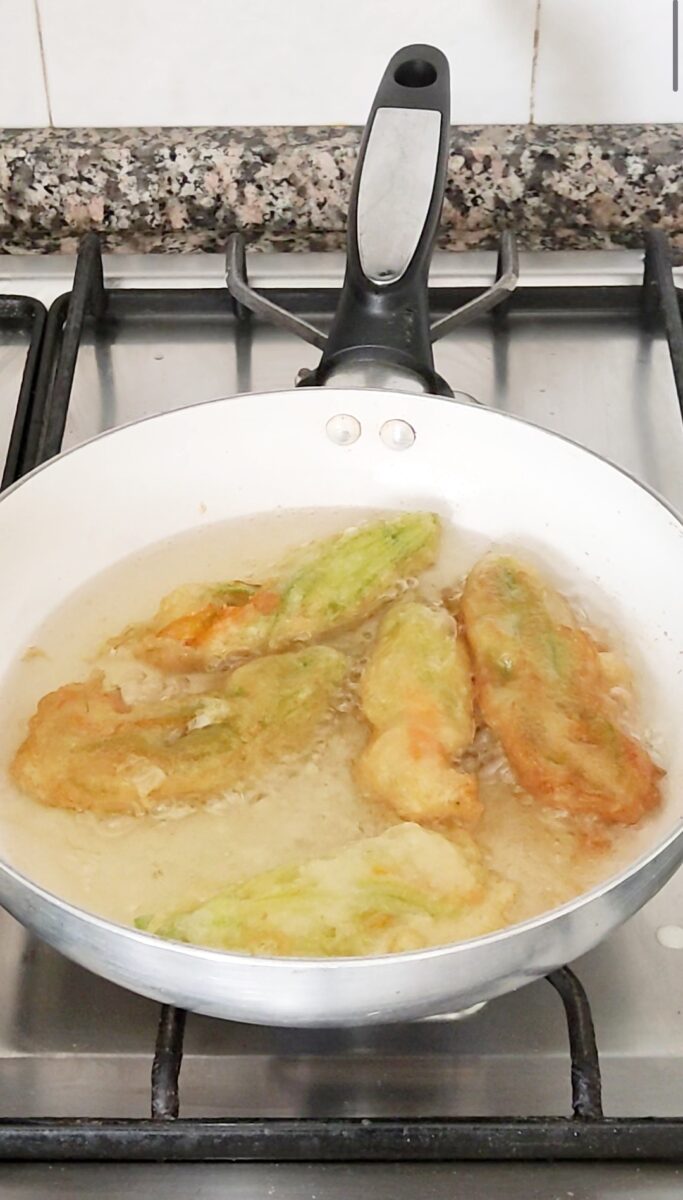 Fate scaldare abbondante olio di semi in una padella piccola e profonda. Immergete i fiori ripieni nella pastella e poi tuffateli nell’olio bollente.