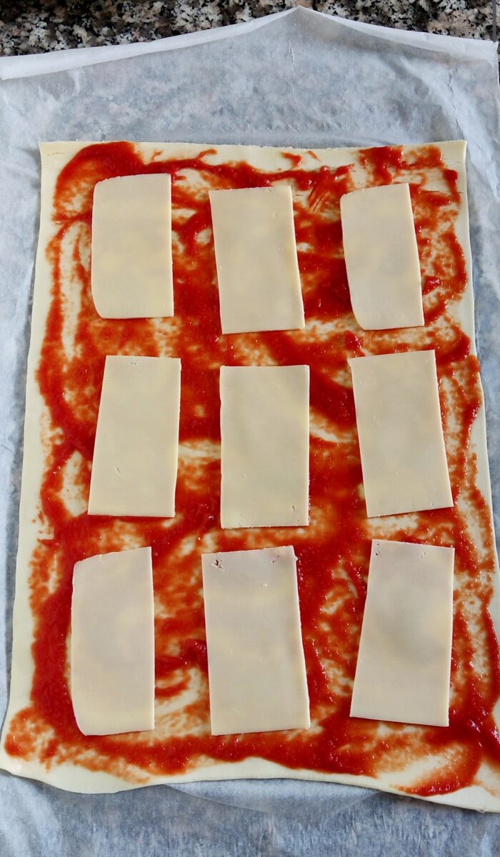 Versate la passata di pomodoro in una ciotola e aggiungete una presa di sale e un pizzico di origano, mescolate. Srotolate sul piano di lavoro un rotolo di pasta sfoglia rettangolare sul piano di lavoro.
