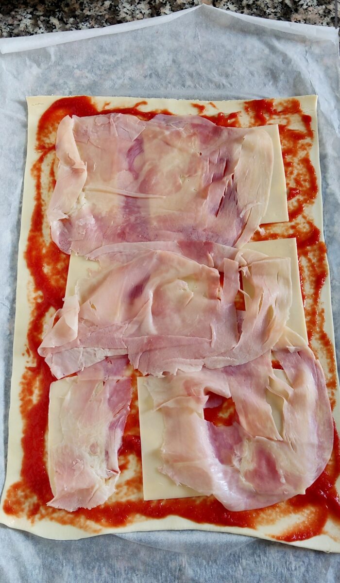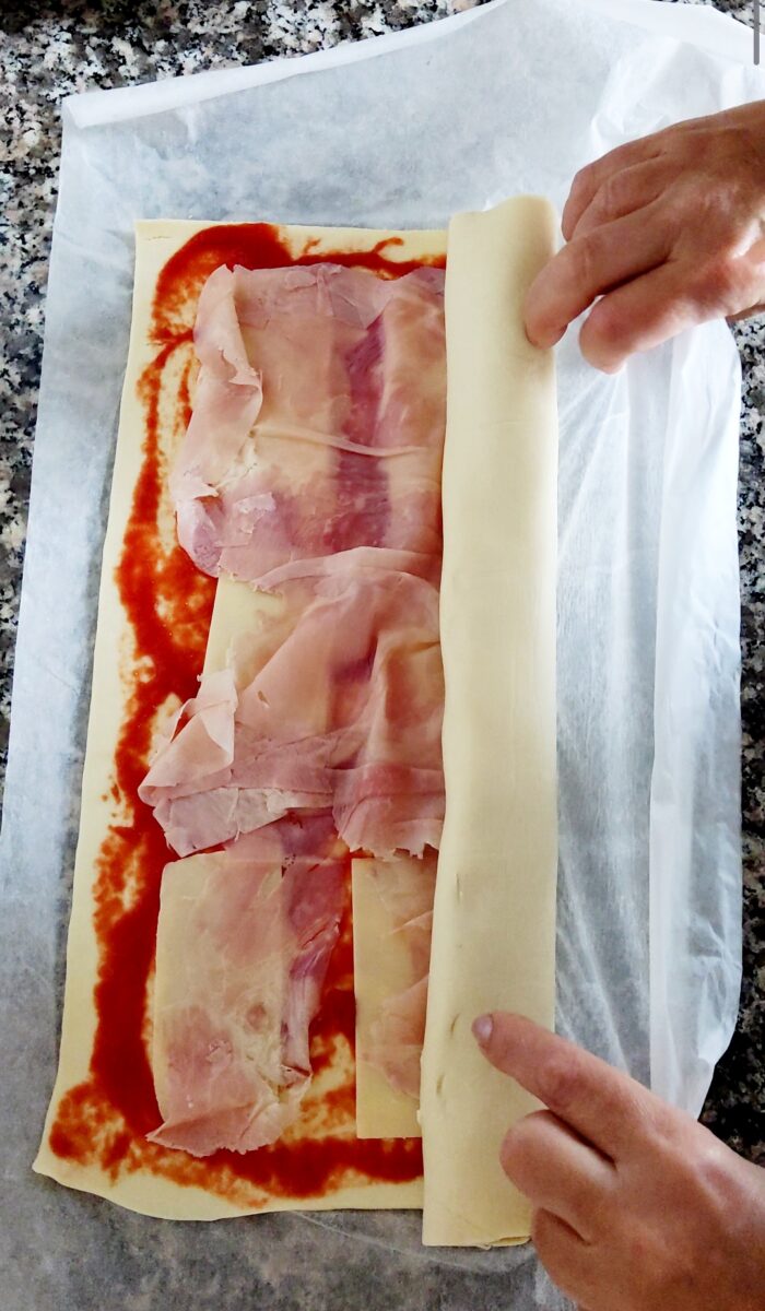Sistemate sulla pasta sfoglia prima le fettine di scamorza o di altro formaggio morbido e poi le fettine di prosciutto cotto. Aiutandovi con la carta da forno arrotolate dal lato più lungo a formare un Rotolo di sfoglia farcito.