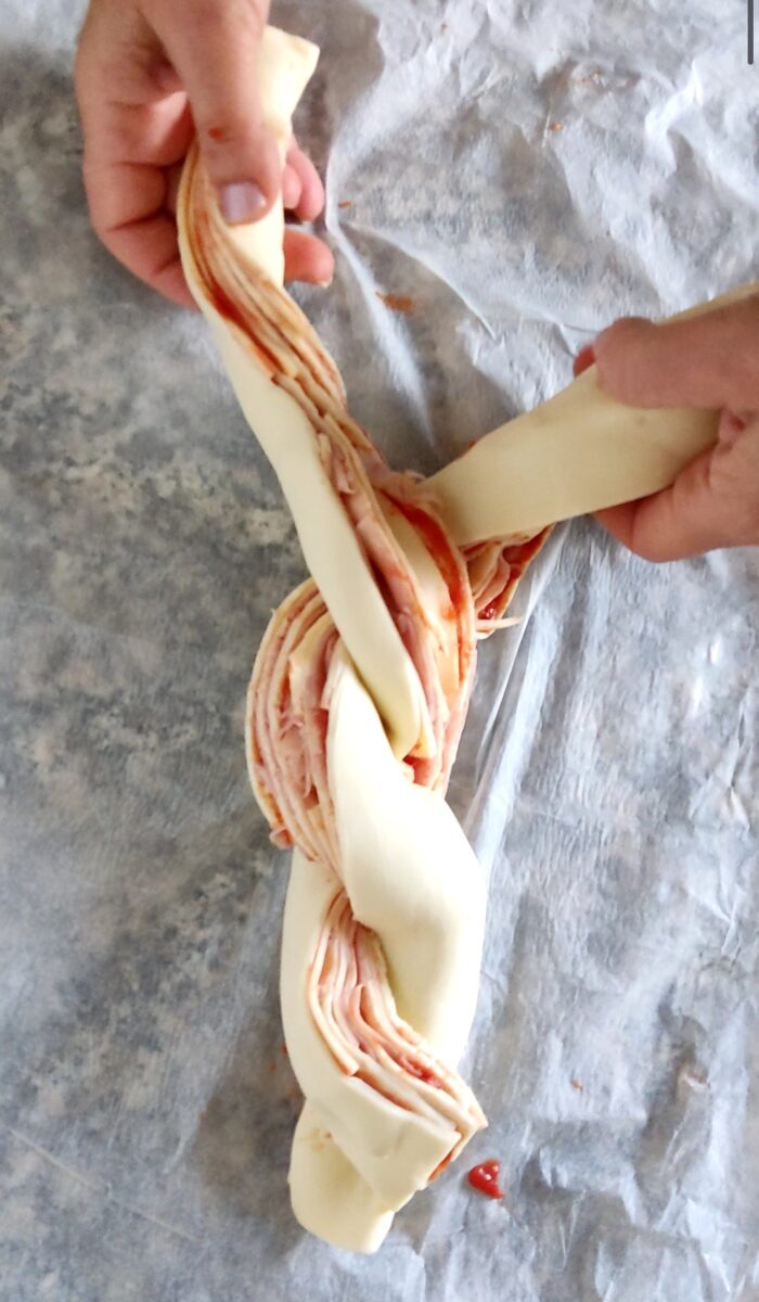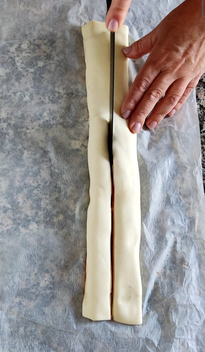 Dividete il rotolo a metà nel senzo della lunghezza. Intrecciate le due parti.