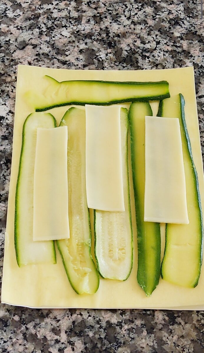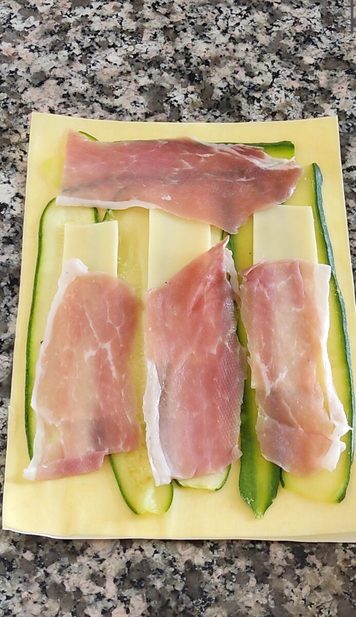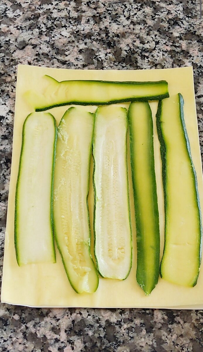 Sistemate sul piano di lavoro una sfoglia fresca per lasagne. Copritela con 6-7 fettine di zucchine.