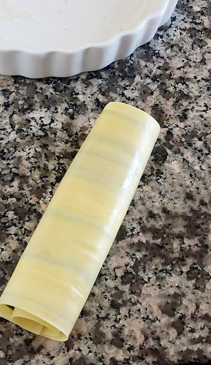 Arrotolate la sfoglia dal lato più corto a formare un rotolo farcito.