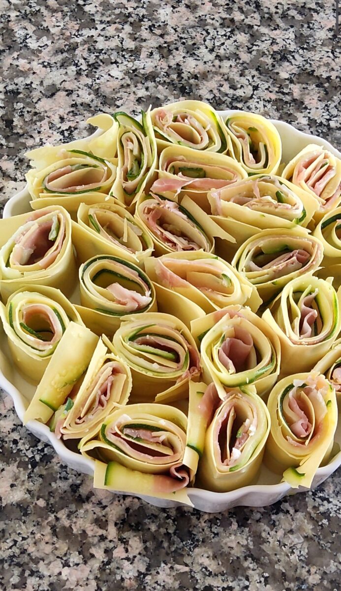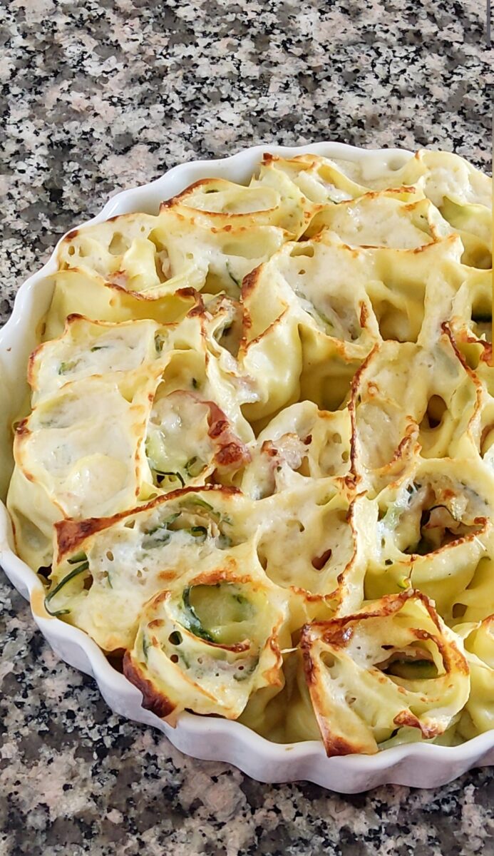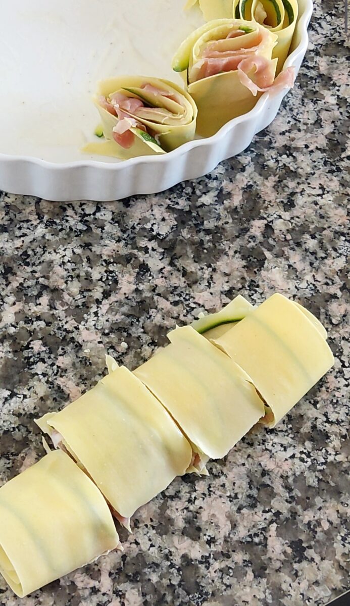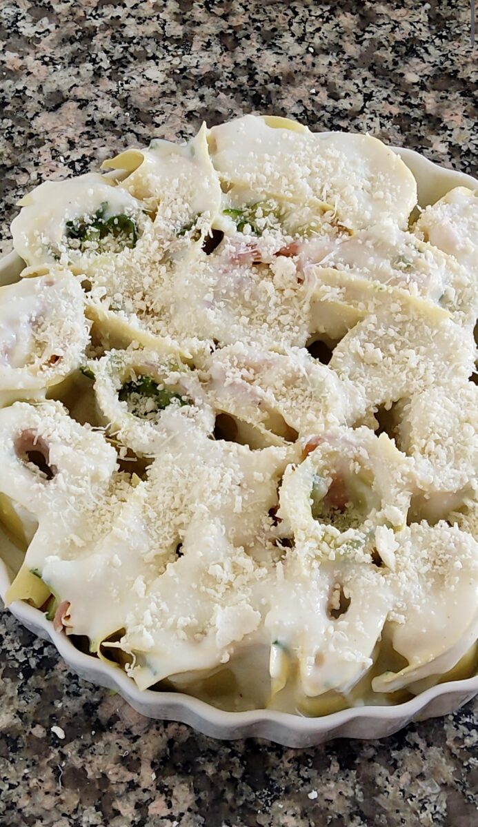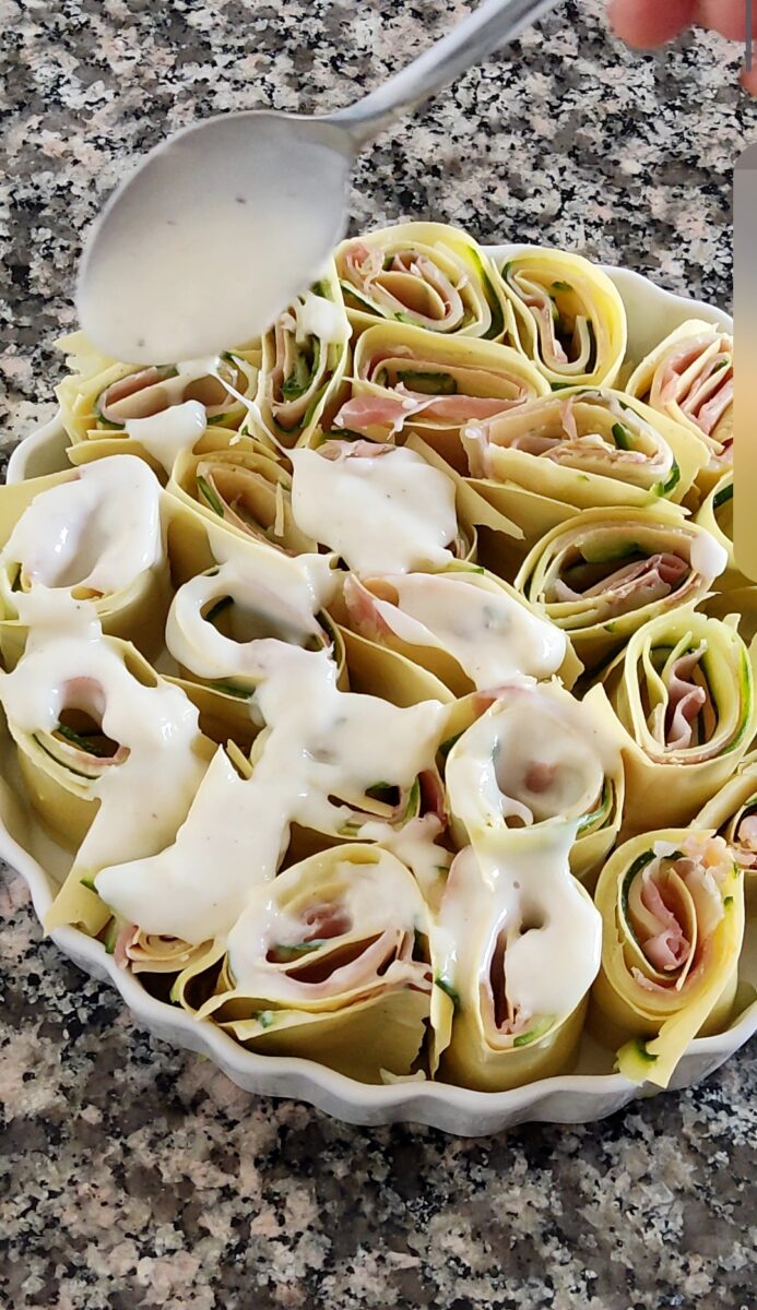 Preparate tutte le sfoglie allo stesso modo e sistemate le girelle nella pirofila allargandole leggermente. Distribuiteci sopra la besciamella lasciandola cadere all’interno delle girelle.