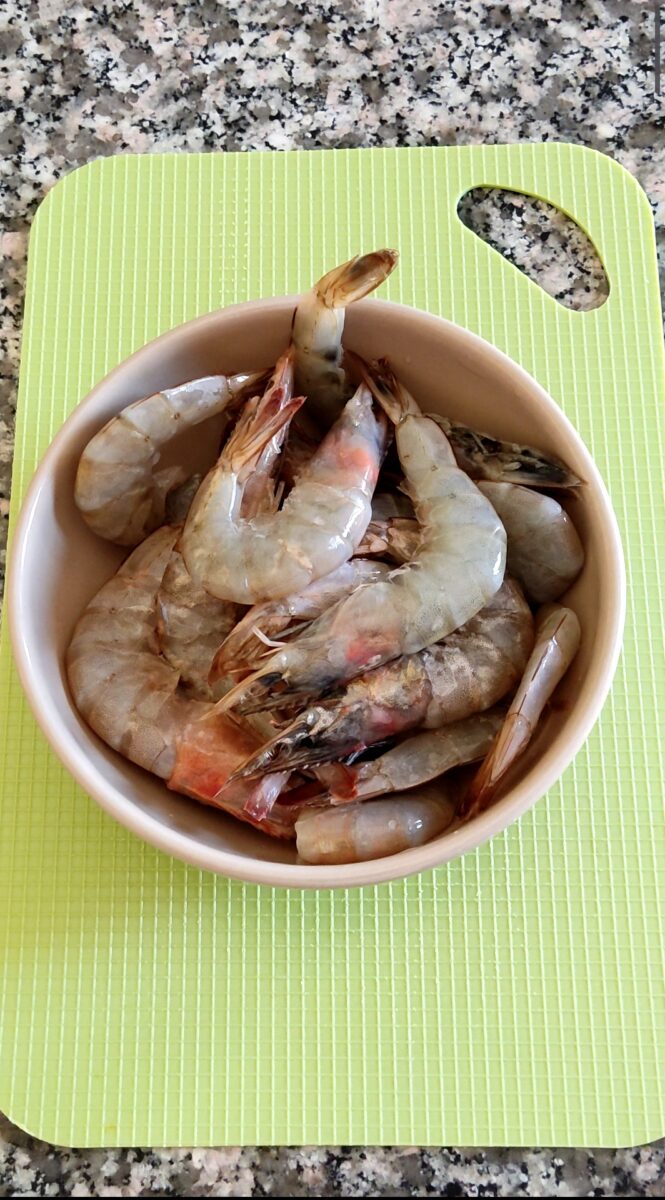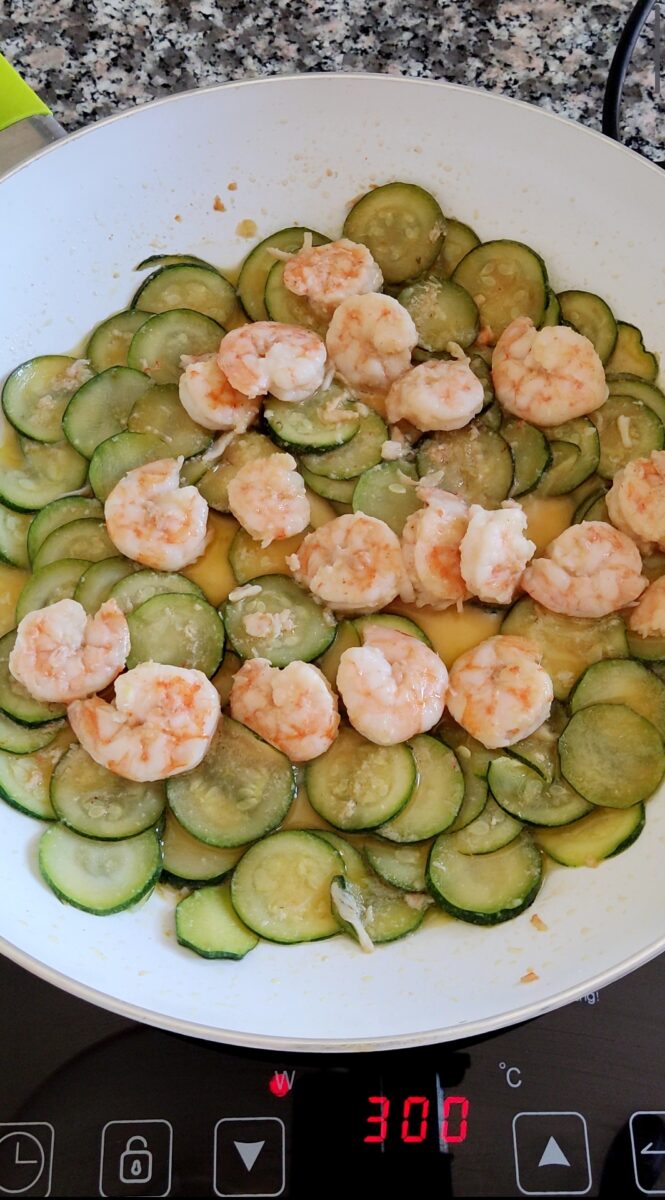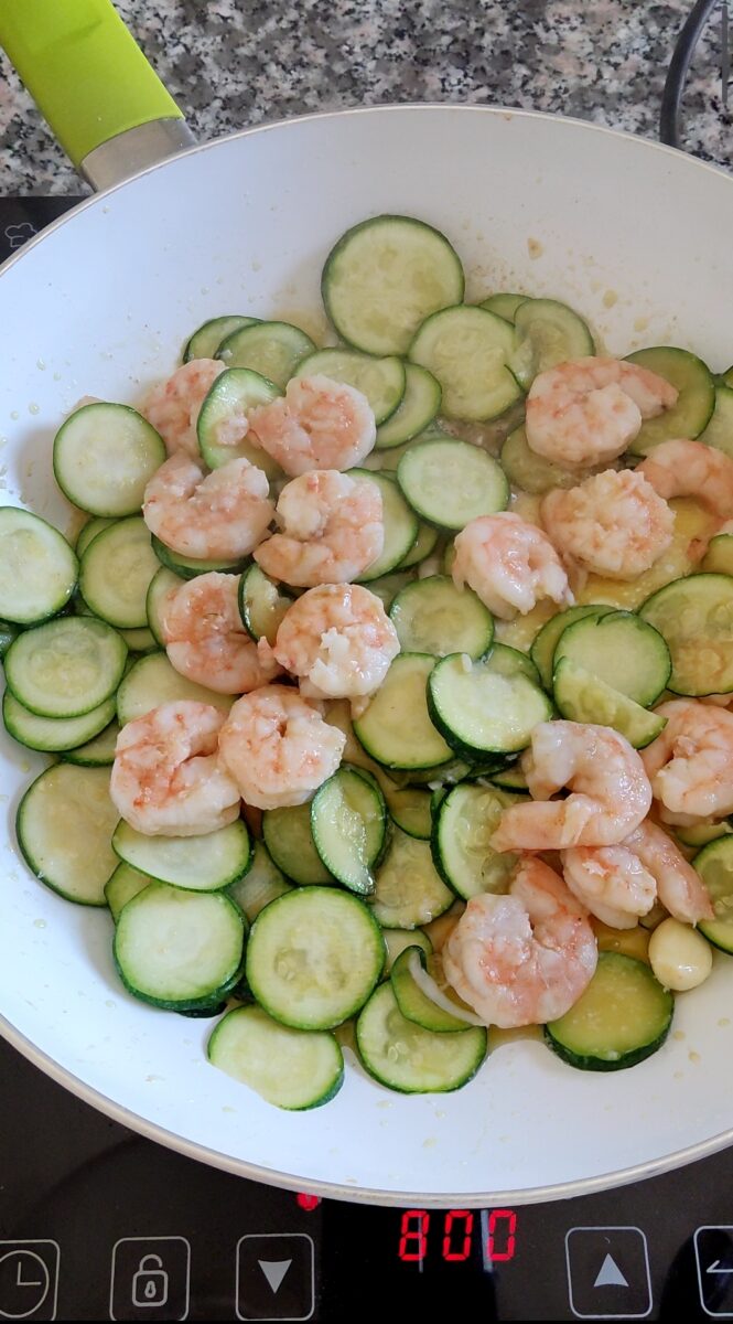Per prima cosa puliti le mazzancolle. Eliminate la testa, sgusciatele e, con l’aiuto di uno stuzzicadenti, eliminate il filino nero dell’intestino. Lavatele sotto l’acqua corrente. Lavate le zucchine, spuntatele alle estremità e tagliatele a fettine sottili.
