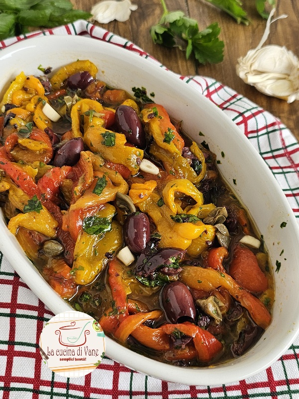 Un piatto estivo immancabile sulle nostre tavole in estate, i peperoni io li cucino molto spesso e una delle ricette in cui mi piace prepararli è proprio questa, perché i peperoni arrostiti e conditi con capperi e olive sono appetitosi e a tavola piacciono sempre a tutti. Si aggiungono odori freschi come basilico e prezzemolo e a piacere anche uno spicchio di aglio, fatti così sono davvero buonissimi!