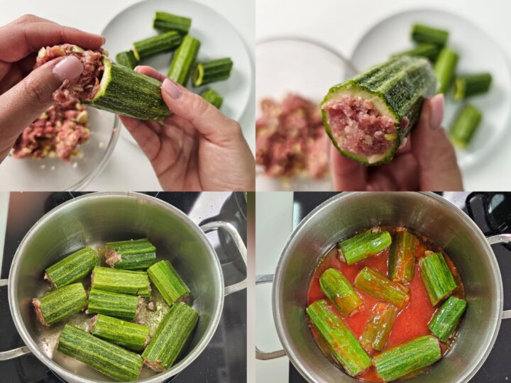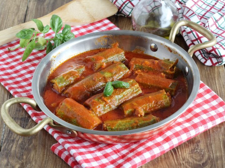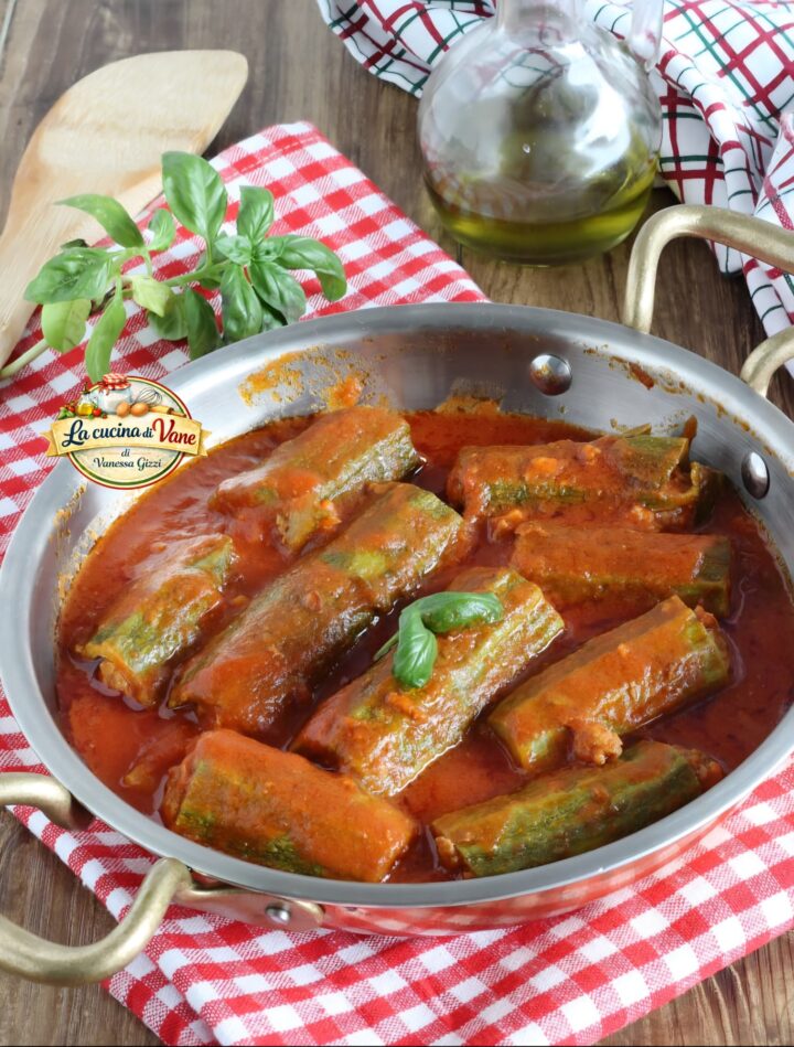 Questa ricetta delle zucchine ripiene di carne cotte in padella nel sugo è una delle più amate: morbide dentro e ricche di un ripieno gustoso a base di carne, pane, uova e aromi mediterranei.