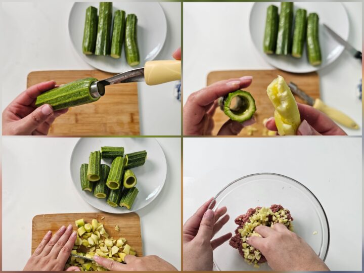 Lava le zucchine, taglia le due estremità e, se sono treppo lunghe, dividile a metà. Svuota l’interno con uno scavino adatto alle zucchine o, in alternativa, con un coltello, facendo attenzione a non rompere a buccia: devono rimanere integre esternamente.