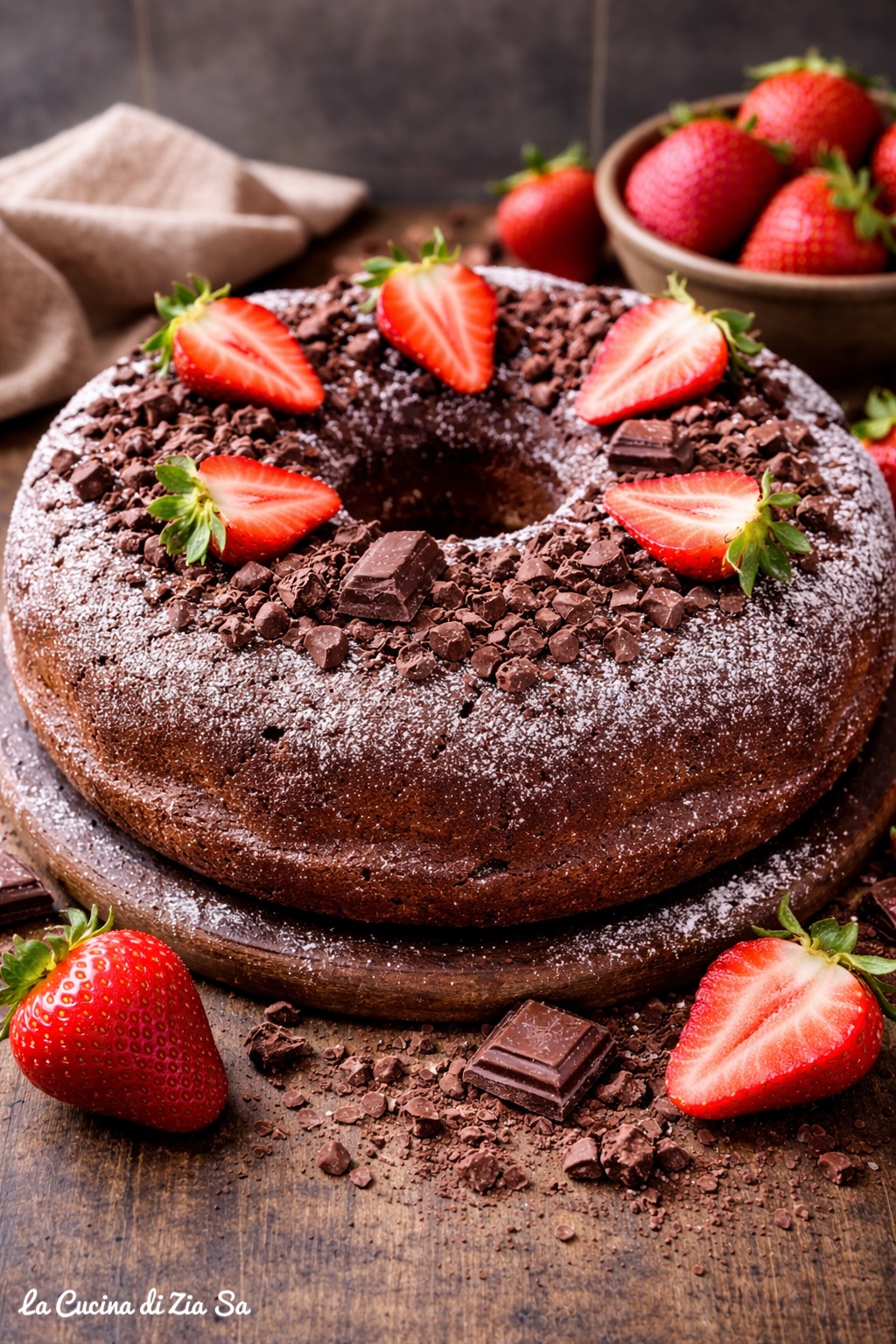 La Ciambella cioccolato e fragole è un dolce buonissimo alto soffice dal cuore morbido di cioccolato fondente e fragole…un abbinamento golosissimo che rende questa ciambella una vera delizia