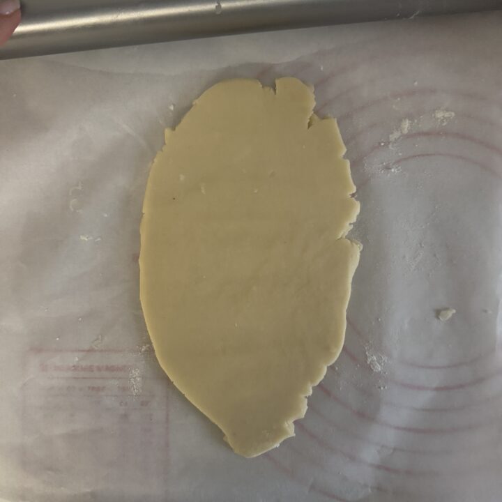 Stendete l’impasto tra 2 fogli di carta forno ad uno spessore di 3 mm.