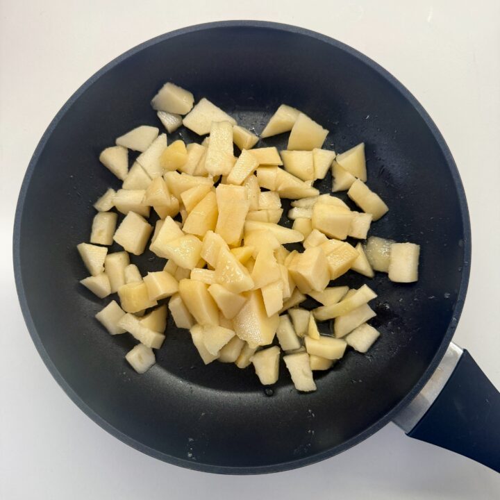 Tagliate 2 pere a pezzettini e metteteli in una padella.