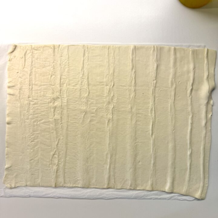 Prendete il rotolo di pasta sfoglia dal frigo e srotolatelo su un piano di lavoro.