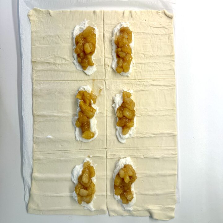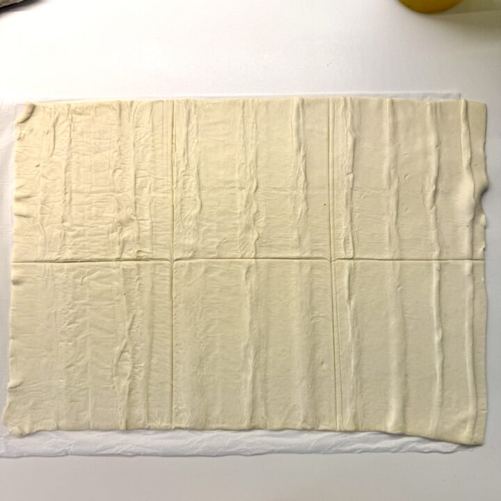 Con un coltello dividete la pasta sfoglia in 6 parti più o meno uguali.