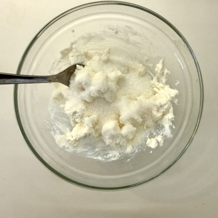 In una ciotola mescolate la ricotta con 2 cucchiai di zucchero.