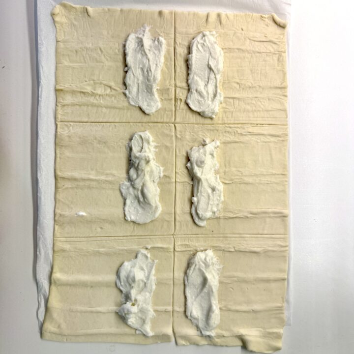 Su un lato di ciascun quadrato spalmate un po’ di ricotta.