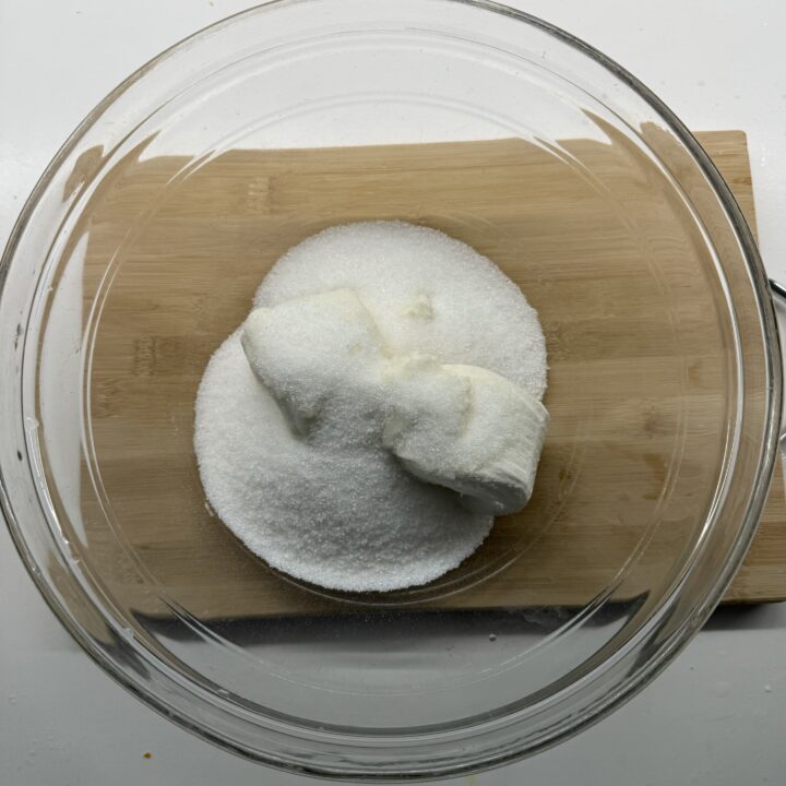 Mettete in una ciotola la ricotta e lo zucchero. Io ho utilizzato la ricotta confezionata senza lattosio, che di per sé è compatta, ma se utilizzate quella fresca, fatela scolare bene per qualche ora prima di utilizzarla.