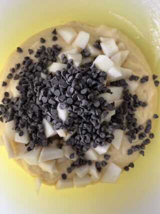 Tagliare due pere a pezzetti piccoli e aggiungerli al composto, unire anche le gocce di cioccolato (lasciandone da parte circa 20 gr per la decorazione finale) e mescolare con un cucchiaio dall’alto verso il basso per distribuire bene gli ingredienti.