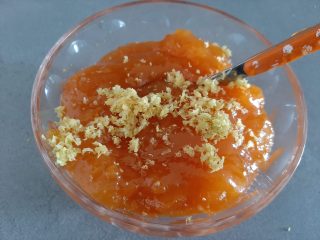 Prendiamo la confettura di albicocche e aggiungiamo la scorza di mezzo limone per darle più sapore.