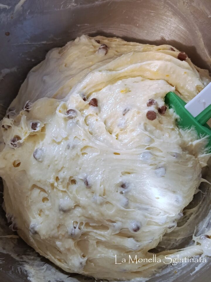 Pulire il bordo l’ impasto deve risultare omogeneo, liscio unire a questo punto aggiungere le gocce di cioccolato fare amalgamare .Ungere con un cucchiaio di olio di semi e con l’aiuto del leccapentole uniformare e compattare l’impasto e formare una palla liscia .