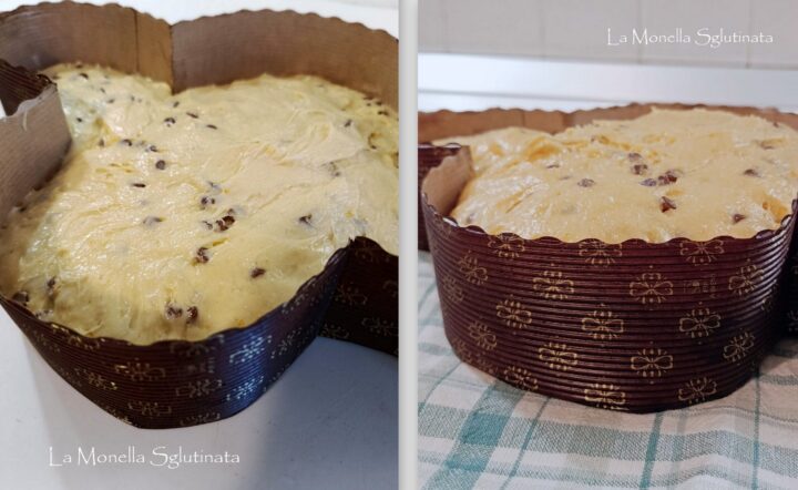 Sistemare i filoncini nello stampo incrociati quello più grande forma il busto l’altro le ali io ho uniformato la colomba. Chiudere in un sacchetto per alimenti e lasciare in forno chiuso fino a che l’impasto ha raggiunto 1 cm dal bordo dello stampo.il tempo necessario varia da tanti fattori umidità, temperatura a me la colomba ha impiegato 3 ore per la giusta lievitazione .