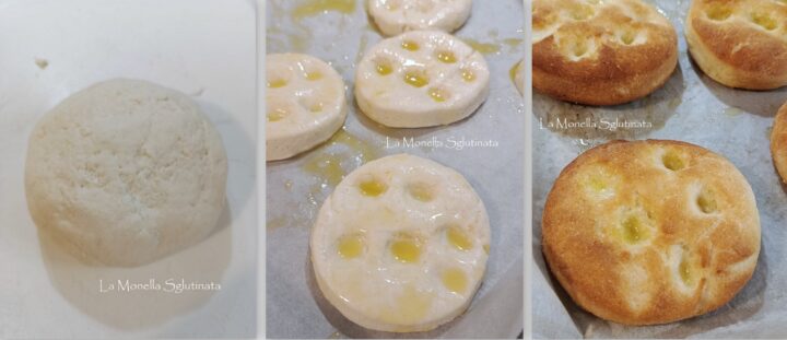 Infarinare la spianatoia con farina di riso, sgonfiare impastare di nuovo a mano e fare delle pieghe , stendere l’impasto di circa 1 cm di spessore e co l’aiuto di un bicchiere o un coppapasta dare la forma alle focaccine adagiare sulla leccarda del forno foderata con carta da forno unta con un pò di olio e lasciare lievitare mezz’ora coperte da un canovaccio asciutto. Accendere il forno a 190 ° prima di infornare fate dei buchi con le dita e spennellare con un emulsione di 4 cucchiai di olio e 4 cucchiai di acqua mescolati con una frusta o una forchetta, infornare e cuocere in forno ventilato caldo finchè non sono dorate .
