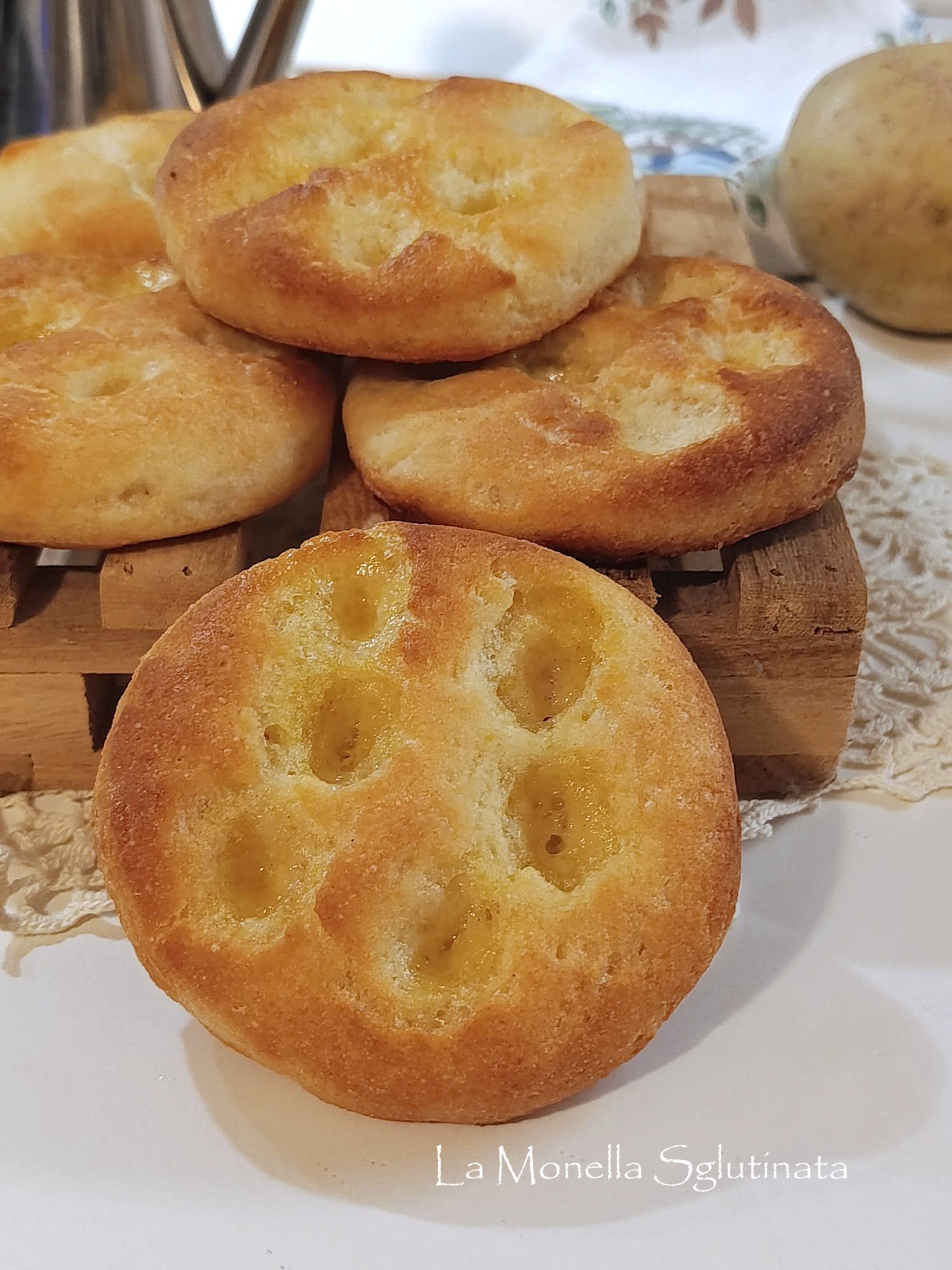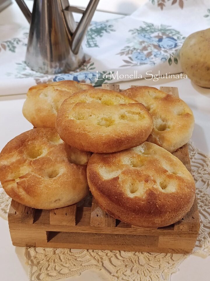 Focaccine di patate senza glutine tanto semplici quanto morbide e gustose, sono ideali per ogni momento dallo stuzzichino salato al buffet oppure come cena con salumi e formaggi. Questa ricetta è nata per caso ,l’impasto lievitato con le patate lesse all’interno era per un altra preparazione dei cururicchi (le ciambelline fritte)ma visto che con l’impasto venivano tante ciambelle, ho pensato di fare delle focaccine da cuocere in forno ma non immaginavo che il risultato fosse così sorprendente. Le focaccine di patate sono morbide e soffici e sono deliziose con un ottimo profumo e si possono anche congelare e scaldare al momento dell’uso .