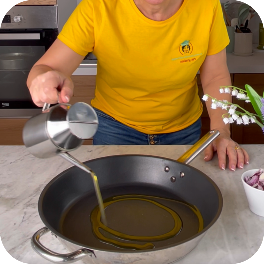 Versiamo l’olio extravergine di oliva all’interno di una padella antiaderente capiente, aggiungiamo la cipolla a pezzetti e subito dopo i fagiolini corallo appena scolati e non asciugati.