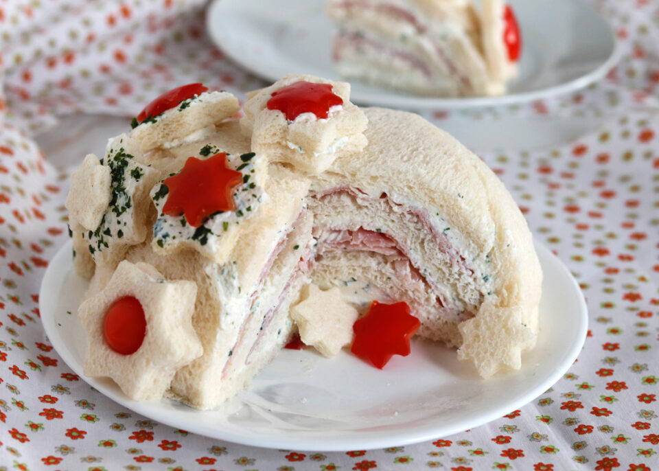 Portate in tavola un tocco di magia con questo zuccotto di Natale con prosciutto cotto e ricotta, una preparazione raffinata che unisce la delicatezza della ricotta al sapore morbido del prosciutto cotto, il tutto racchiuso in una cupola soffice di pane e decorato con stelline colorate di pane, pomodorini e crema di ricotta, con un tocco di prezzemolo fresco.