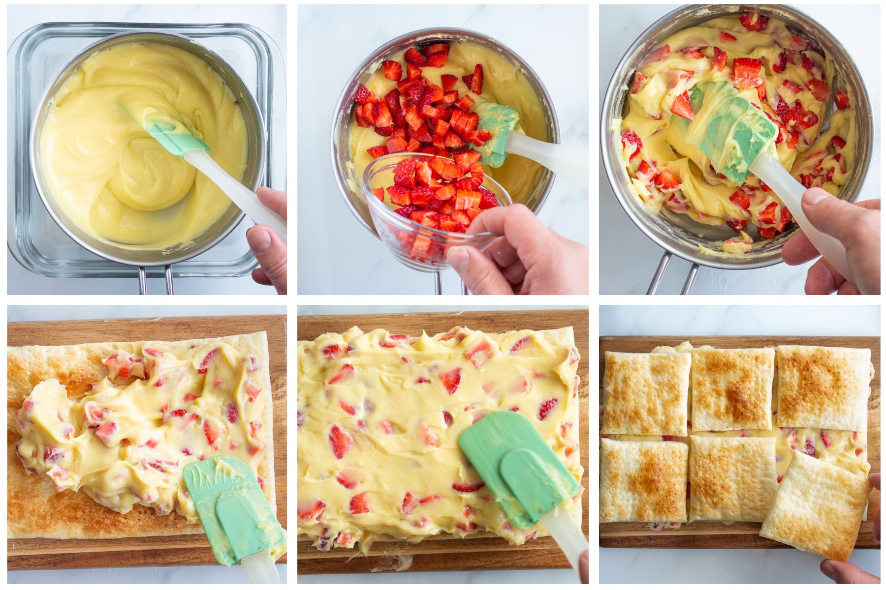 Tagliate le fragole a dadini, quindi mescolatele alla crema. Farcite con la crema coprite con l’altra metà di sfoglia. Spolverizzate con zucchero a velo.