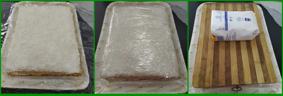 Adesso copriamo la nostra Biancaneve con della pellicola, poggiamo sopra un tagliere e un peso (tipo una scatola di latte oppure un pacco di zucchero) e mettiamo nel frigo per una notte intera. In questo modo, il dolce avrà tempo di ammorbidirsi.