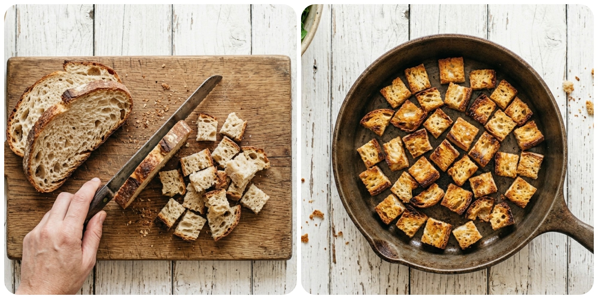 CROSTINI: Evita di usare il forno. Scalda un po’ d’olio in padella e fai tostare i cubetti di pane finché non diventano dorati e croccanti all’esterno. Aggiusta di sale e pepe. Una volta pronti, metti i crostini da parte.