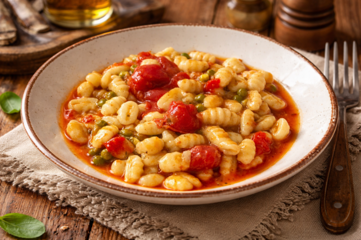 Se c’è un piatto che racconta davvero la tradizione della cucina italiana, sono gli gnocchi di patate con sugo di costine di maiale in umido con piselli: una ricetta ricca, profumata e profondamente legata ai sapori di casa. Morbidi gnocchi fatti a mano si sposano con un condimento intenso e avvolgente, dove le costine di maiale cuociono lentamente fino a diventare tenerissime, mentre i piselli aggiungono una nota dolce e bilanciata.