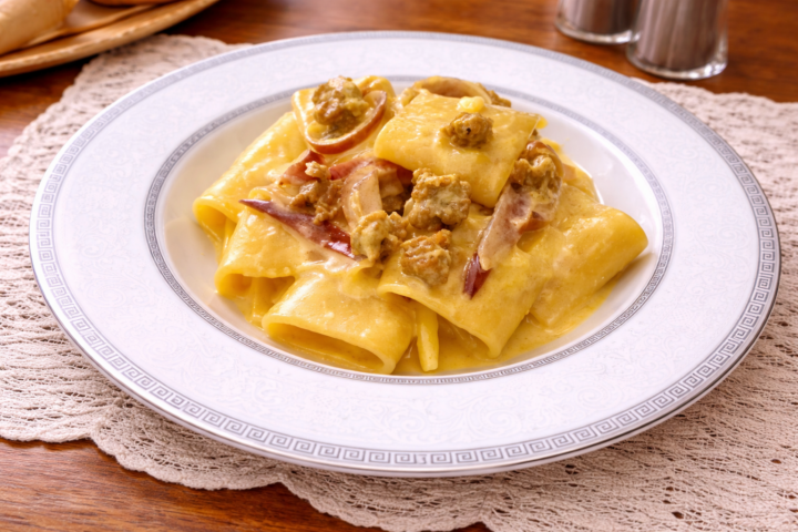 Paccheri con salsiccia e zafferano un cremoso primo piatto con salsiccia, zafferano, scalogno e crema di latte, facile e veloce da realizzare. Un primo molto saporito e che piace a tutti.