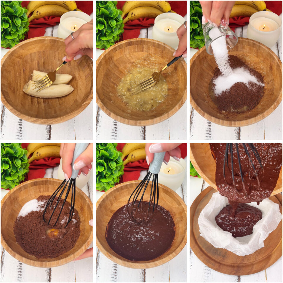 In una ciotola schiacciamo una banana riducendola in purea. Aggiungiamo un uovo, il cacao amaro e lo zucchero. Mescoliamo bene sino ad ottenere una miscela senza grumi.