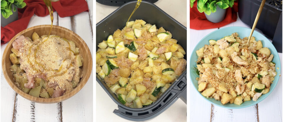 Trasferiamo le patate con pollo e zucchine nel cestello della friggitrice ad aria, aggiungiamo un filo d’olio sopra e cuociamo a 190°C per circa 20 minuti, girando tutto a metà cottura. Se invece vogliamo cuocerli in forno, basterà trasferire tutto su una teglia, aggiungere un filo d’olio e cuocere a 200°C per circa 35 minuti o sino a quando sarà tutto dorato.