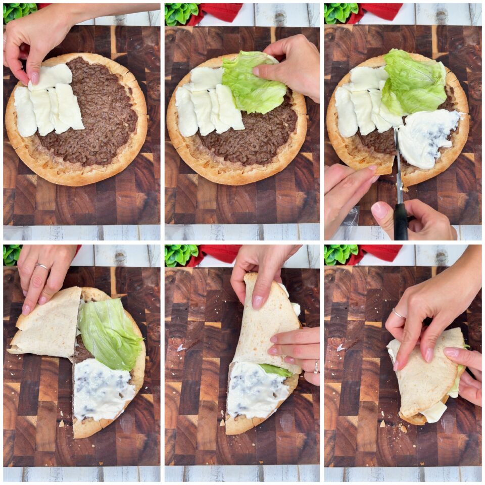 Quando è pronta, arriva il momento della farcitura. Immagina idealmente di dividere la superficie della piadina in quattro sezioni. In ognuna potrai distribuire gli ingredienti che preferisci: io delle fette di provola, foglie di lattuga, maionese o qualsiasi altro condimento a piacere. Poi, con delle forbici da cucina, pratica un taglio fino al centro della piadina. Inizia a ripiegarla su sé stessa seguendo le pieghe del condimento, fino a ottenere una forma compatta e triangolare, simile a un ventaglio.
