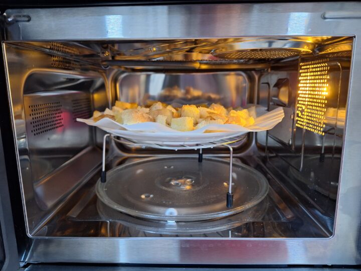 Disponi i cubetti conditi in un piatto con carta da forno evitando di sovrapporli. Mettilo sul rialzo alto del forno a microonde.