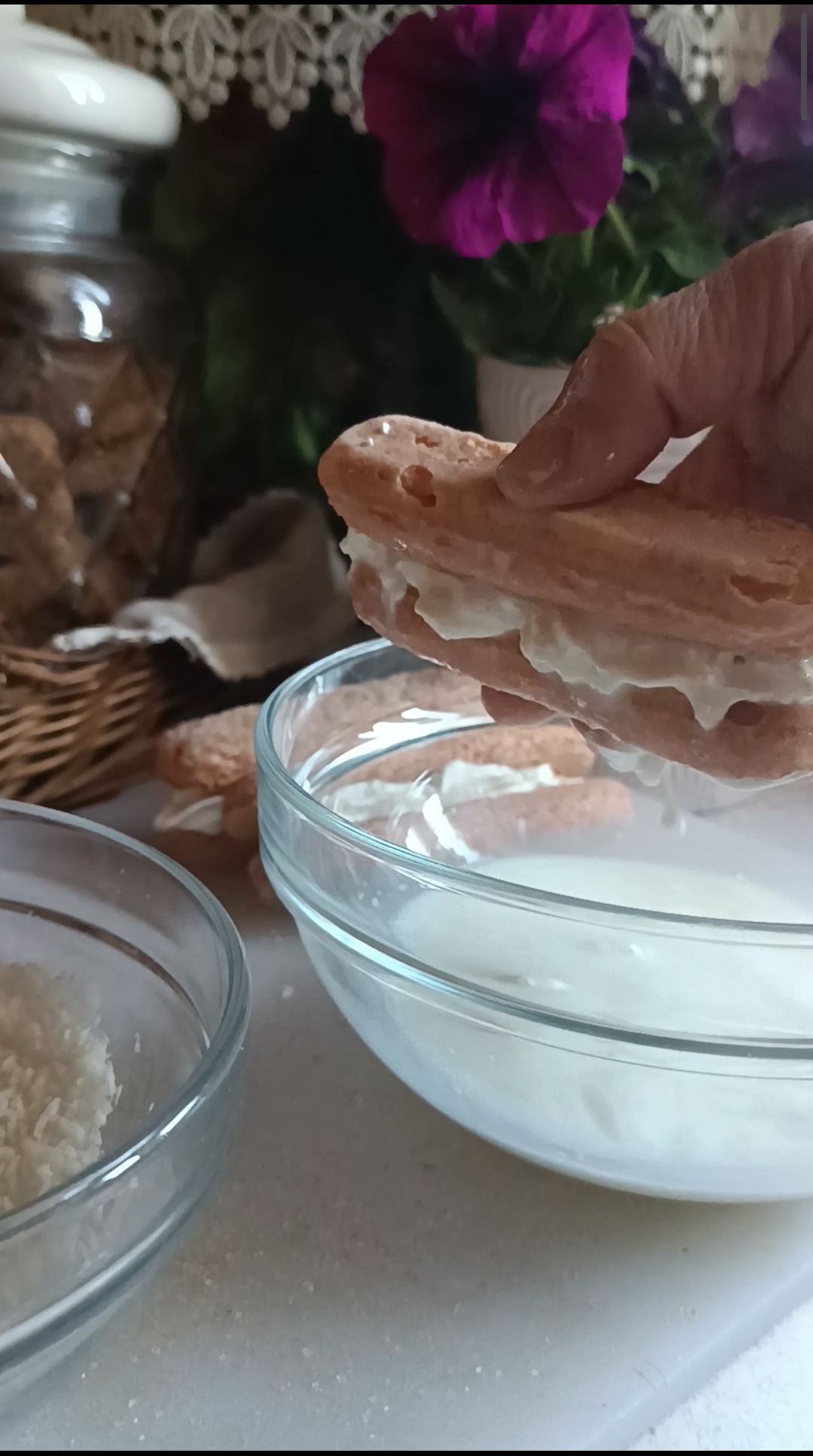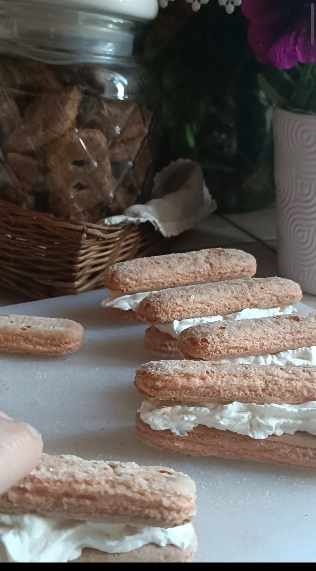 Metti la crema al mascarpone in una sac a poche con il beccuccio largo. Ricopri la superficie di un savoiardo con la crema al mascarpone e copri con un altro savoiardo.
