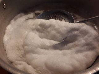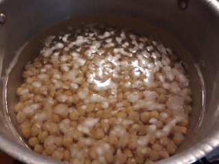 Dopo 12 ore metti tutto sul fuoco moderato e fai riscaldare vedrai uscire della schiuma. Raccogli la schiuma e butta,sono tutte le impurità dei ceci ed il bicarbonato.