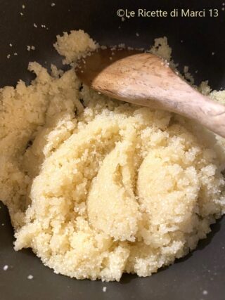 Prendete un pentolino e mettete a scaldare il latte, il sale, il burro, la scorza grattata del limone e arancia, portare a sfiorare il bollore e – fuori fuoco – incorporate la semola, poco alla volta, con una frusta a mano, poi rimettere sul fuoco al minimo, fino a quando sfrigola e si stacca dalle pareti (ci vorranno 3-4 minuti).