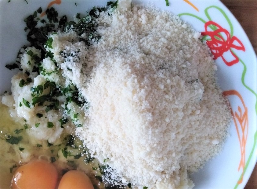Quando la mollica è ben gonfia e ammorbidita, strizzarla e aggiungere prezzemolo e aglio tritati al coltello su un tagliere, un pizzico di sale, grana grattugiato, le 2 uova e pepe nero a piacere.