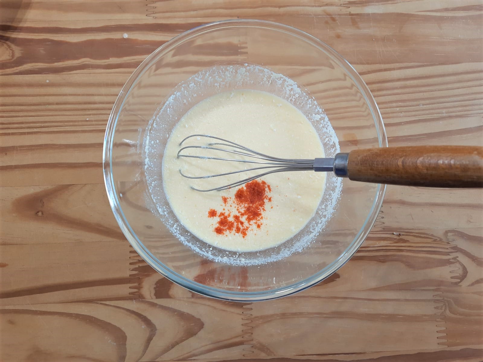 In una ciotola lavorare con un frusta a mano: uova, latte, panna, formaggio grattugiato, sale e paprika dolce fino ad ottenere un composto omogeneo.