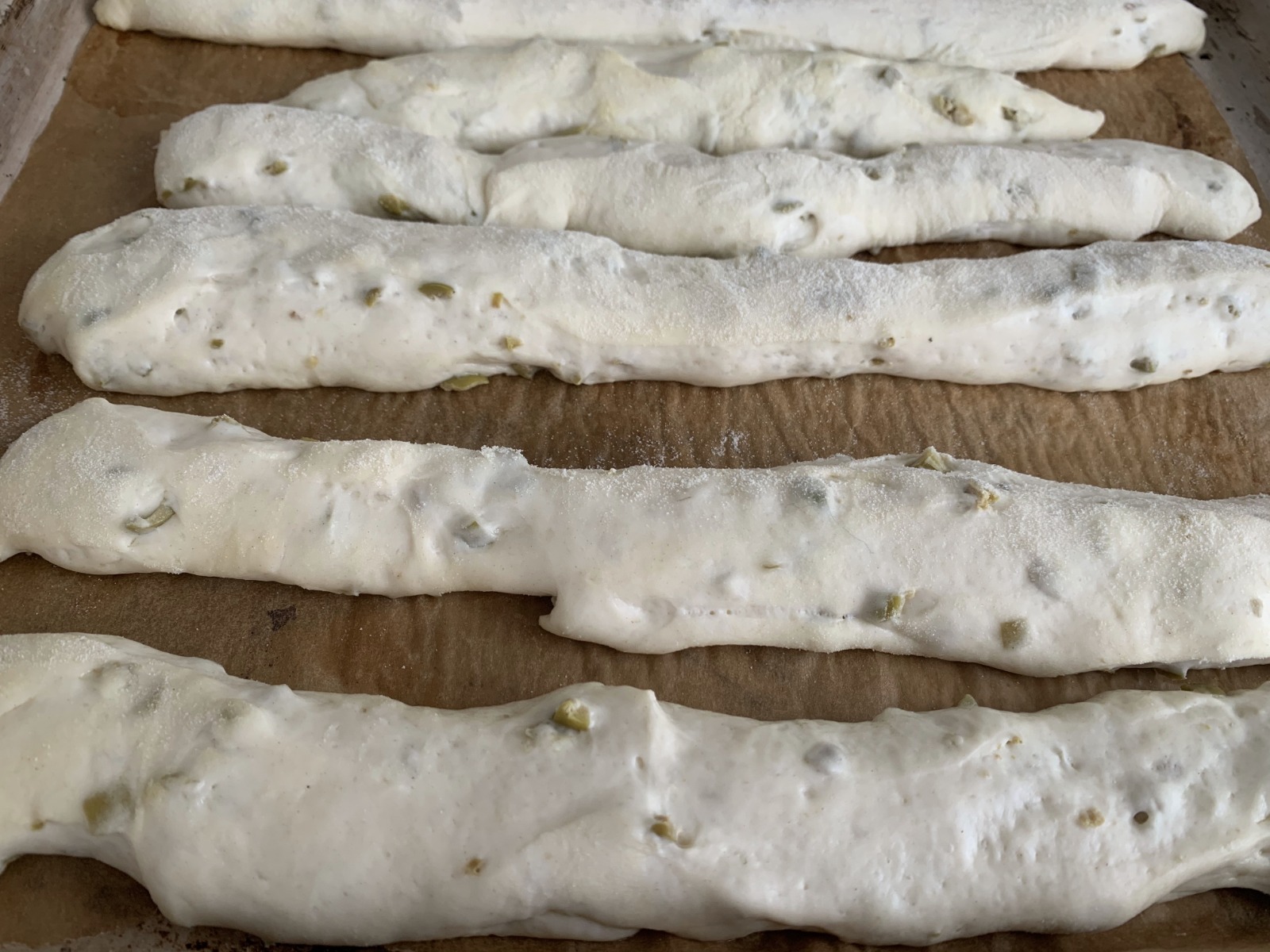 Trasferite l’impasto dei BASTONCINI DI PANE ALLE OLIVE in un contenitore oliato e fatelo lievitare per circa 12 ore, a temperatura ambiente. Deve raddoppiare di volume.