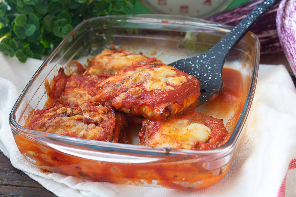 I FAGOTTINI DI MELANZANE AL FORNO sono dei piccoli pacchetti di fette di melanzane (cotte al forno oppure fritte) ripieni di prosciutto cotto e mozzarella, cotti al forno con aggiunta di salsa di pomodoro e formaggio. Pochi ingredienti che danno vita a un piatto ricco di gusto e sfizioso.