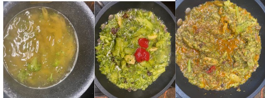 È un primo piatto povero ma ricchissimo di gusto, perfetto per il pranzo di tutti i giorni e capace di mettere d’accordo tutti. I broccoli vengono lessati brevemente e poi ripassati in padella con cipolla, olive, uvetta e pomodoro. Io ho usato il concentrato di pomodoro, che dona un sapore intenso e deciso, ma si può tranquillamente usare anche la passata di pomodoro o dei pomodorini freschi tagliati a pezzetti. Il condimento cuoce lentamente fino a diventare quasi una crema, profumata e saporita.