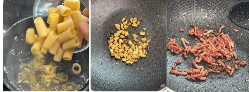 Lessate la pasta e tostate le noci e rosolate lo speck:
